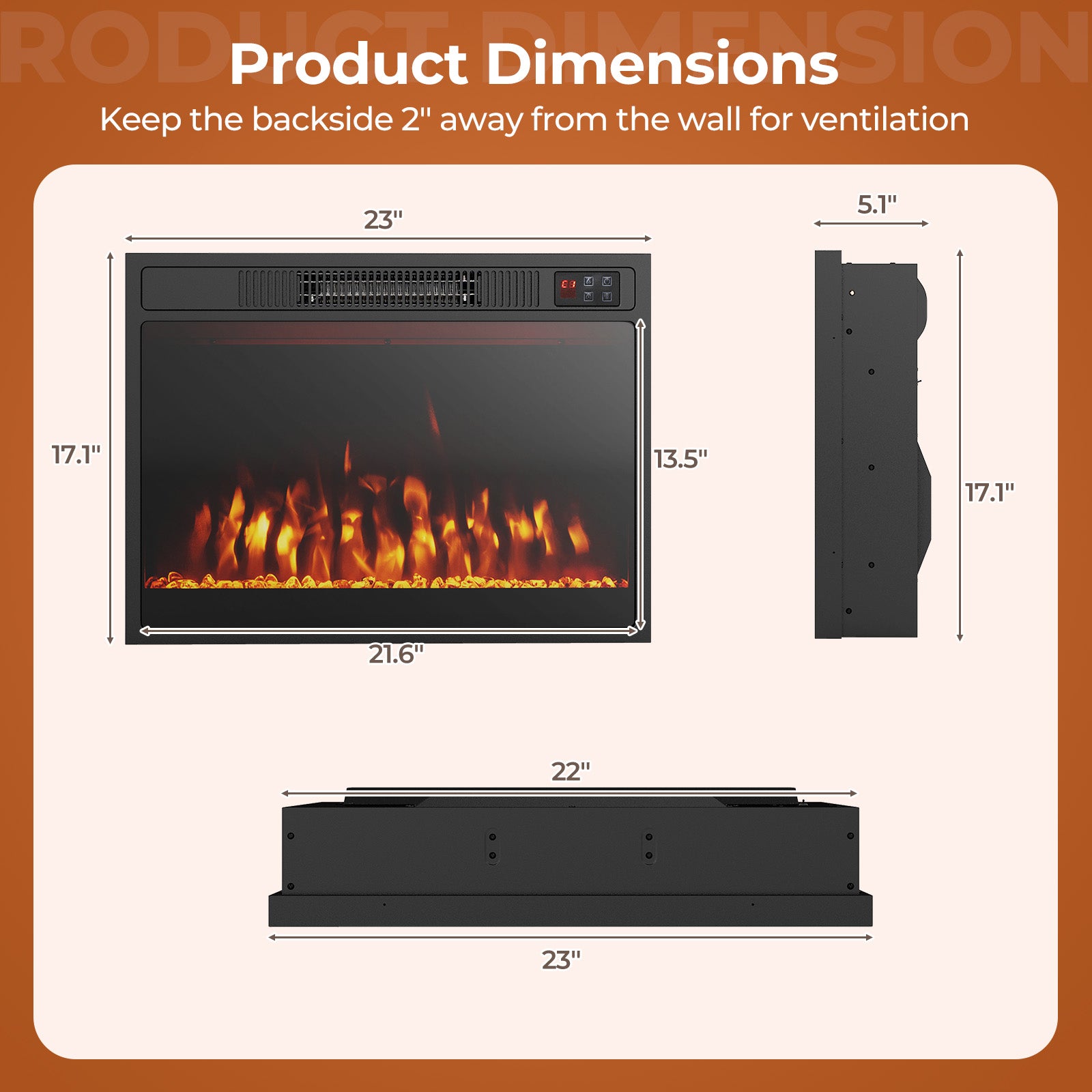 ● Stylish and Space-Saving Design: With dimensions of 24.2 inches in length 5.1 inches in width and 17.7 inches in height this sleek electric fireplace integrates effortlessly into your TV stand or mantel setup. It also includes a 6-foot power cord for added convenience.